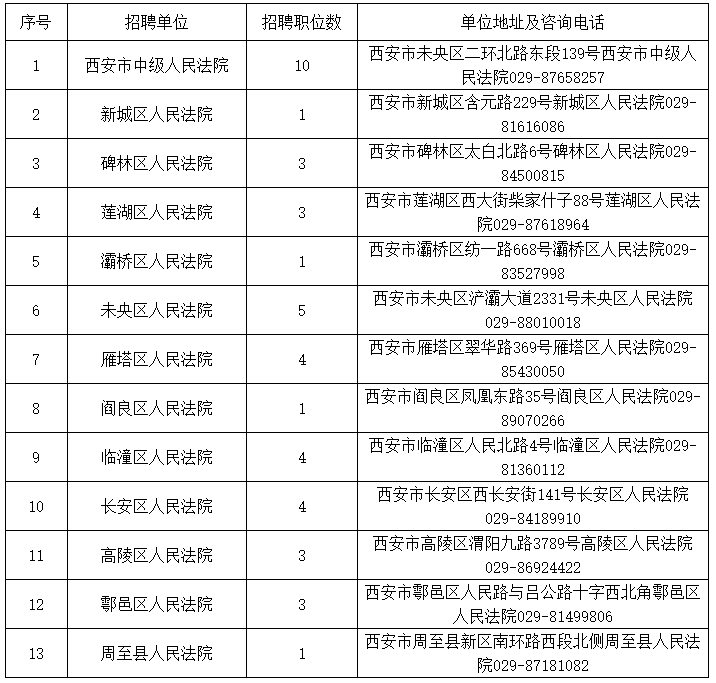 全市法院共招聘聘用制書記員43名,各法院招聘職位、地址及政策咨詢電話詳見《西安法院2023年面向社會公開招聘聘用制書記員職位表》(附件)。